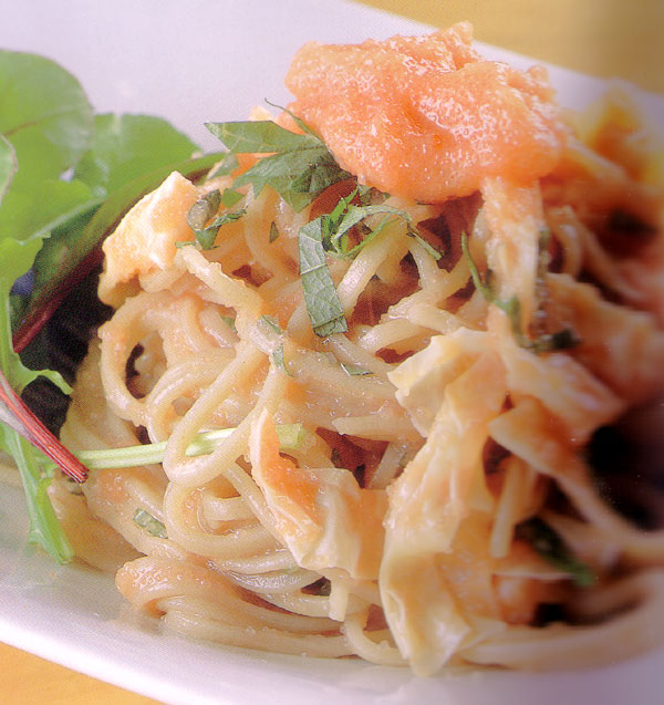 そばは茹でてからかけ汁とあえ、ほぐしてからペースト状にした明太子や豆乳にしたして戻した湯葉とからめてベビーリーフルやルッコルとともに盛り付ける。
