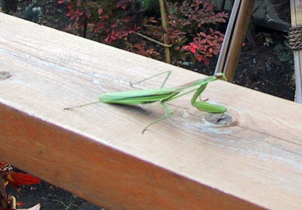 そろそろ雪が降る季節なのに、いまごろカマキリがいるなんて。ウッドデッキの手すりにじっと動かず時を過ごしておりました。全世界で2,000種前後るいるそうです。カマキリといえばメスがオスを共食いと連想しますが実際は、あまり見られないようです。ただし、秋が深まって捕食昆虫が少なくなると他の個体も重要な餌となってくる。真冬に孵化することもあるようです。写真をクリックすると大きくなります。